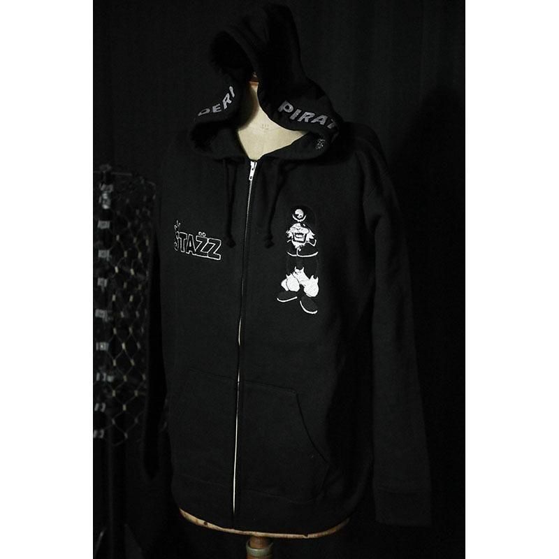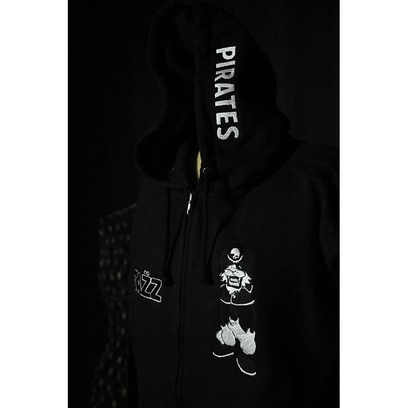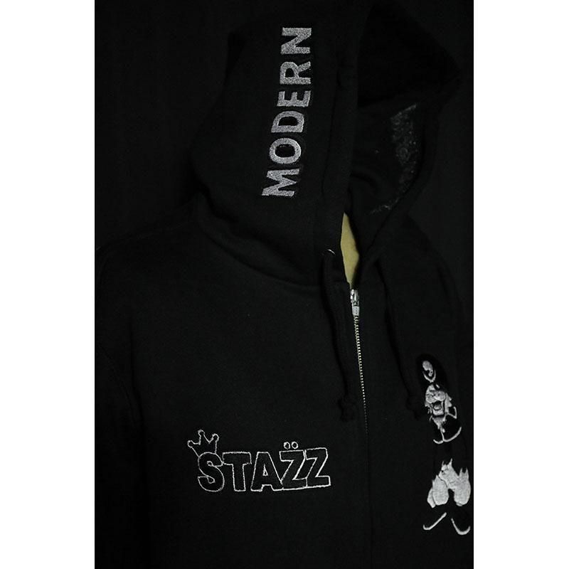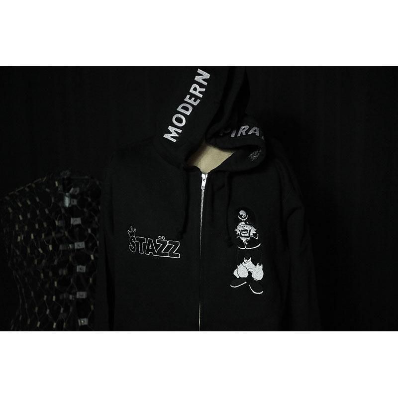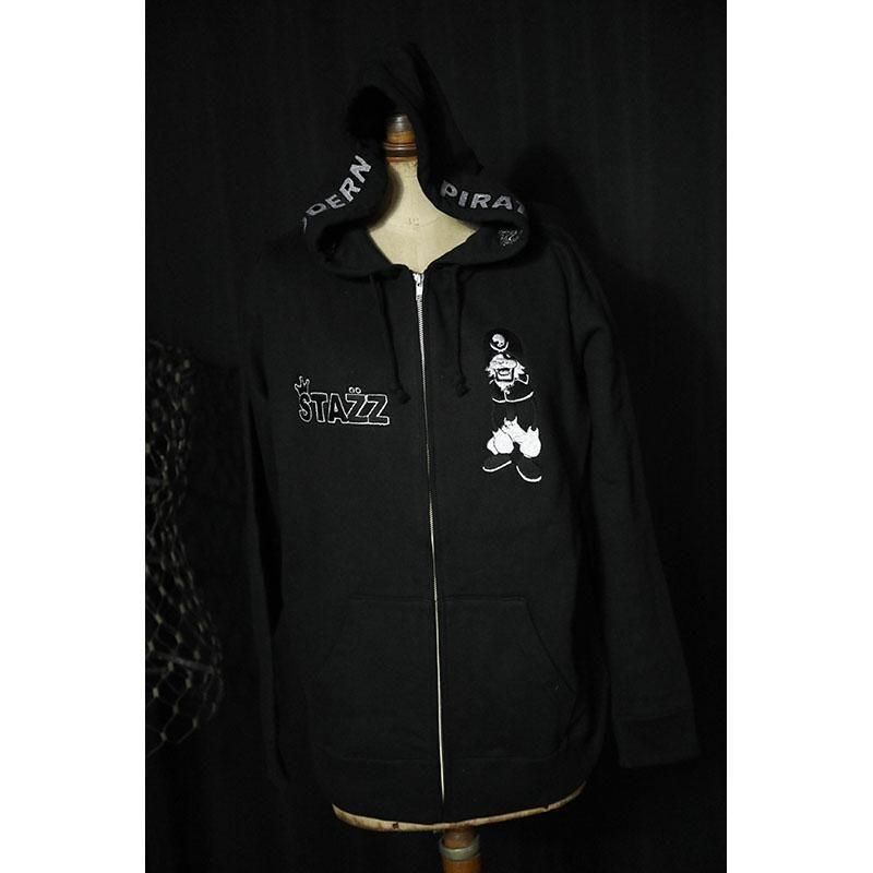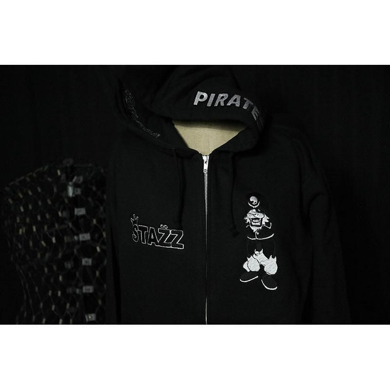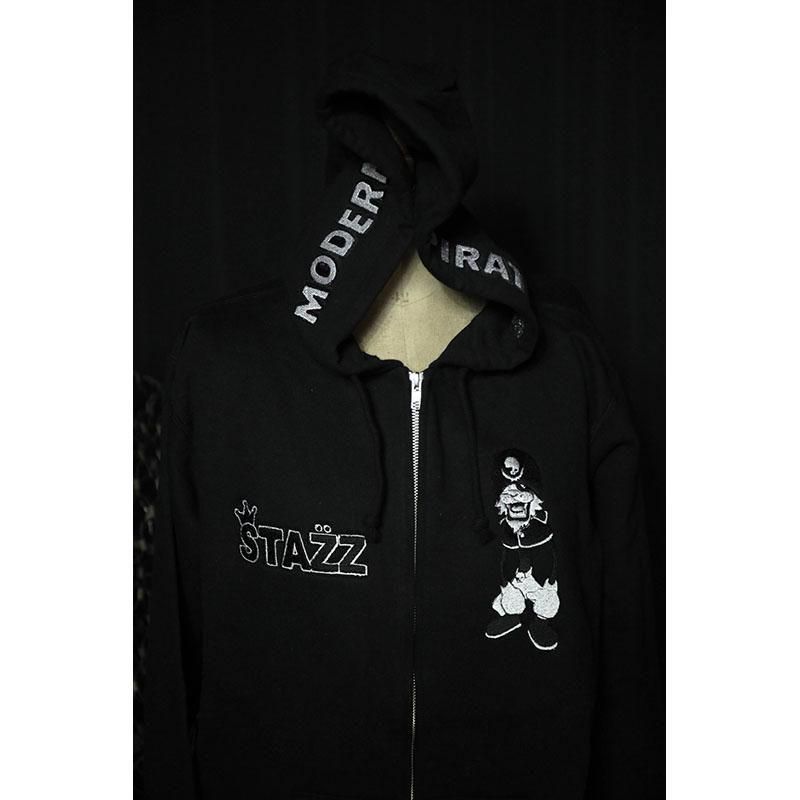 フード両サイドにMODERNPIRATESのロゴ、左胸にSTAZZ-kun、右胸にSTAZZ LOGOを刺繍しました。