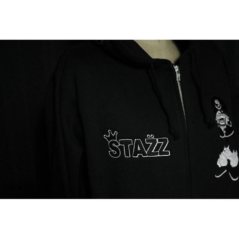 STAZZくんを刺繍した12.4ozの保温性に優れた裏起毛フルジップ パーカです。