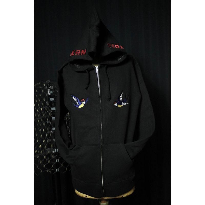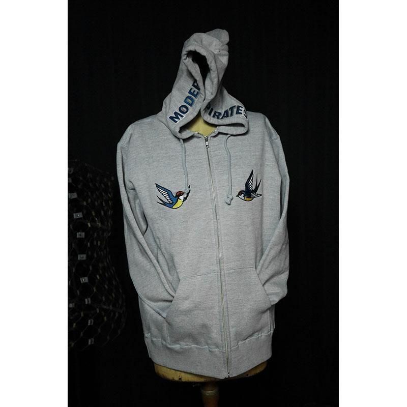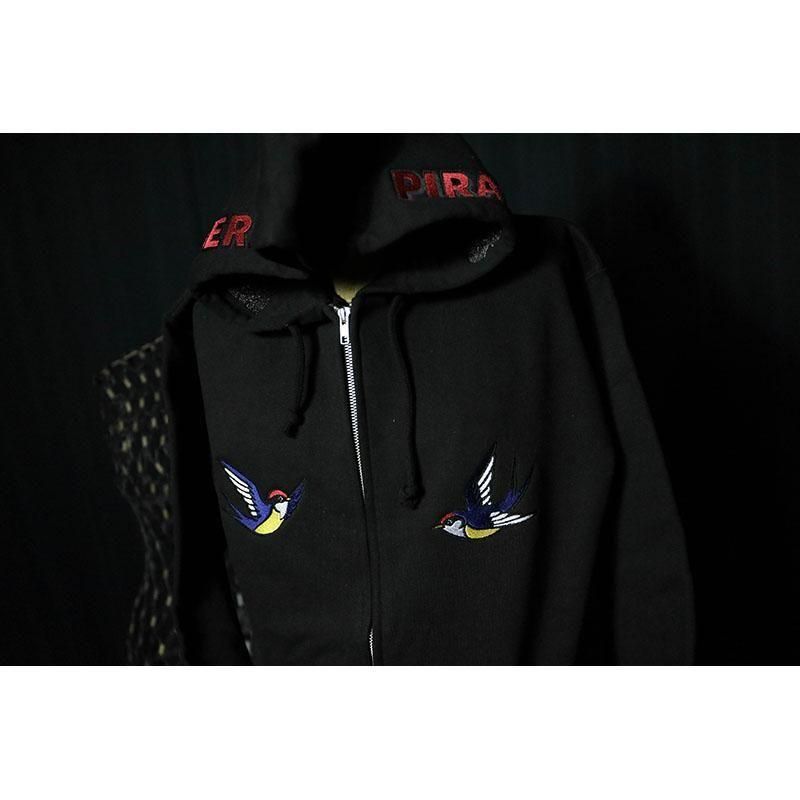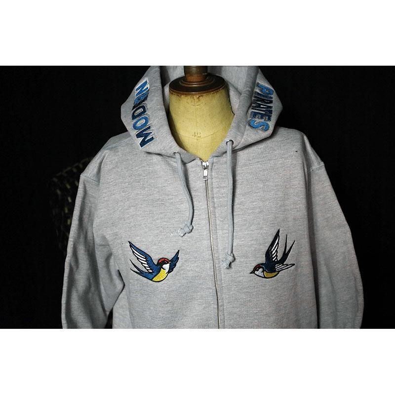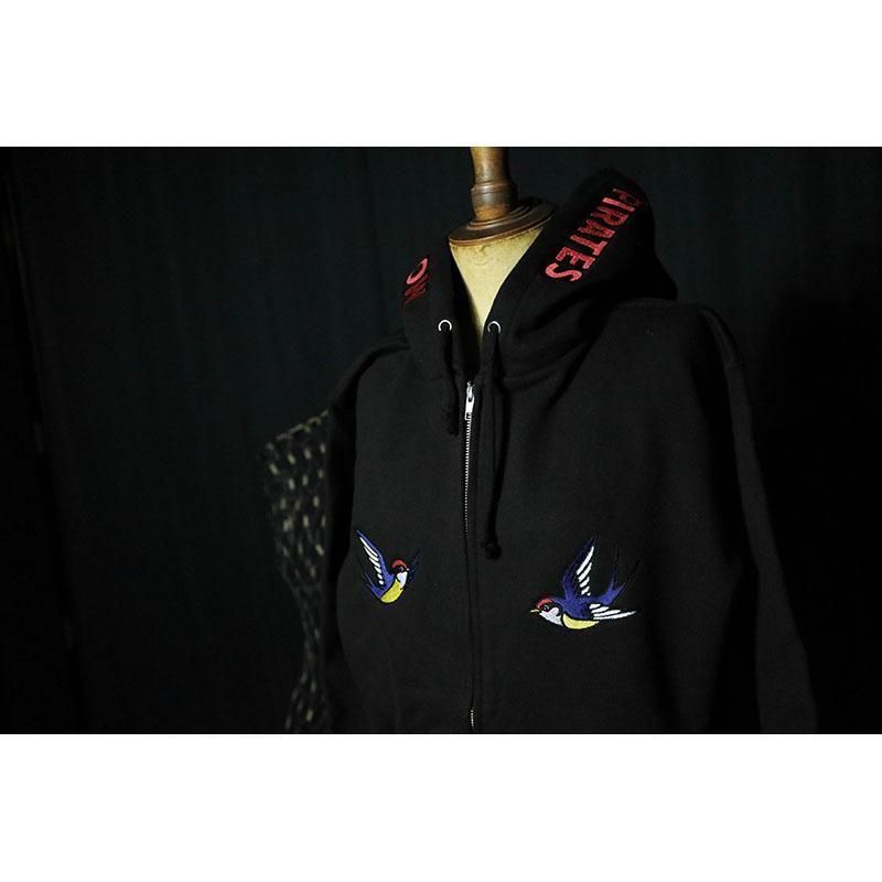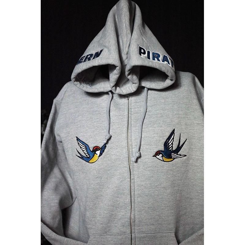 フード両サイドにMODERNPIRATESのロゴ、左右の胸にSwallowを刺繍しました。