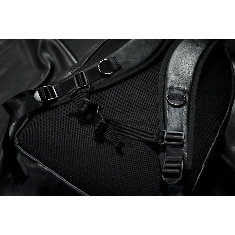 背中部分およびショルダー部分はオールシーズン快適にご使用していただけるようにメッシュ素材、体への負担を軽減出来るようにクッション材を使用しています。